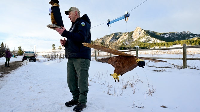 Boulder, Colorado, also takes no chances with nibbling rodents. Flatiron Freddy is also stuffed. Take a look at a park ranger after he took Freddy off the raptor he "flew in on" and "showed him" his shadow in the shade in 2023.