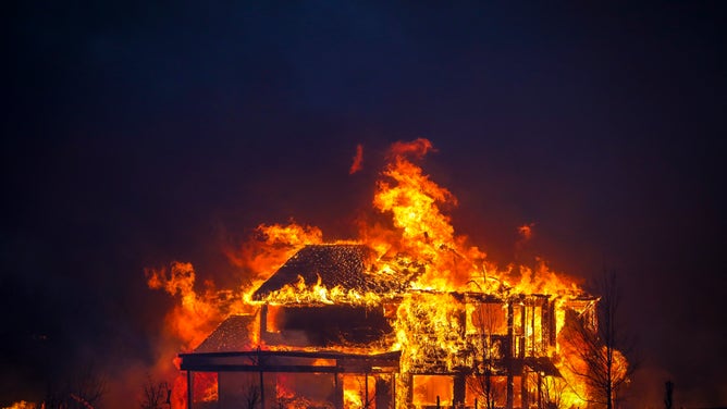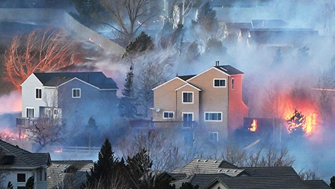 Image 75 of 93Flames engulf homes as the Marshall Fire spreads through a neighborhood in the town of Superior in Boulder County, Colorado on December 30, 2021. - Hundreds of homes are feared lost in fast-moving wildfires in the US state of Colorado, officials said Thursday, as flames tear through areas desiccated by a historic drought. At least 1,600 acres have burned in Boulder County, much of it suburban, with warnings that deaths and injuries were likely as the blaze engulfes hotels and shopping centers. Extreme winds topping 100 mph caused grass fires to quickly spread into the Colorado towns of Superior and Louisville resulting in the mandatory evacuation of over 30,000 residents. Colorado Governor Jared Polis has declared a state of emergency due to the grass fires in Boulder County. (Photo by Jason Connolly / AFP) (Photo by JASON CONNOLLY/AFP via Getty Images) ( )
