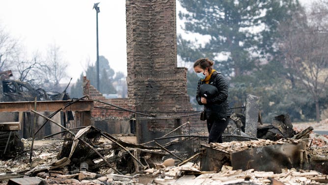 Image 48 of 93Elise Delaware walks through the remains of her childhood home in The Enclave neighborhood of Louisville, Colorado on December, 31, 2021. - A fast-spreading wildfire that tore through several Colorado towns -- laying waste to entire neighborhoods "in the blink of an eye," according to the governor -- had largely burned itself out Friday, with heavy snow expected to douse any remaining embers. (Photo by Jason Connolly / AFP) (Photo by JASON CONNOLLY/AFP via Getty Images) ( )