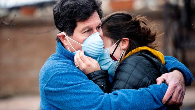 Image 49 of 93Louie Delaware embraces his daughter Elise after seeing the remains of their home destroyed by the fire in Louisville, Colorado on December, 31, 2021. - A fast-spreading wildfire that tore through several Colorado towns -- laying waste to entire neighborhoods "in the blink of an eye," according to the governor -- had largely burned itself out Friday, with heavy snow expected to douse any remaining embers. (Photo by Jason Connolly / AFP) (Photo by JASON CONNOLLY/AFP via Getty Images) ( )