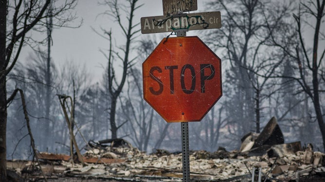 Image 41 of 93LOUISVILLE, CO - DECEMBER 31: A stop sign and street signage peeled and cracking after intense heat from a wildfire in the aftermath of the Marshall Fire on December 31, 2021 in Louisville, Colorado. Most every house in the neighborhood had burnt down to the foundation. The fast moving wind driven fire that erupted Thursday in multiple spots around Boulder County forced some 30,000 people out of their residences and may have destroyed as many as 1,000 homes. (Photo by Marc Piscotty/Getty Images) ( )
