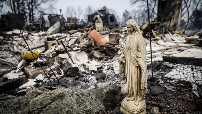 Image 51 of 93A statue of the Virgin Mary is all that remains at the site of a home in The Enclave neighborhood of Louisville, Colorado on December 31, 2021. - A fast-spreading wildfire that tore through several Colorado towns -- laying waste to entire neighborhoods "in the blink of an eye," according to the governor -- had largely burned itself out Friday, with heavy snow expected to douse any remaining embers. (Photo by Jason Connolly / AFP) (Photo by JASON CONNOLLY/AFP via Getty Images) ( )