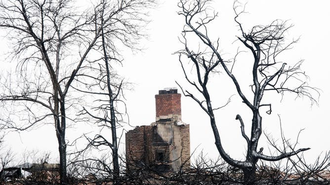 Image 56 of 93A lone chimney is all that remains of a home destroyed by the Marshall Fire in Boulder County, Colorado on December 31, 2021. - A fast-spreading wildfire that tore through several Colorado towns -- laying waste to entire neighborhoods "in the blink of an eye," according to the governor -- had largely burned itself out Friday, with heavy snow expected to douse any remaining embers. (Photo by Jason Connolly / AFP) (Photo by JASON CONNOLLY/AFP via Getty Images) ( )