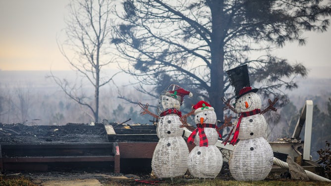 Image 57 of 93LOUISVILLE, CO - DECEMBER 31: Snowmen stand beside the remains of a deck and a home in the aftermath of the Marshall Fire on December 31, 2021 in Louisville, Colorado. The fast moving wind driven fire that erupted Thursday in multiple spots around Boulder County forced some 30,000 people out of their residences and may have destroyed as many as 1,000 homes. (Photo by Marc Piscotty/Getty Images) ( )