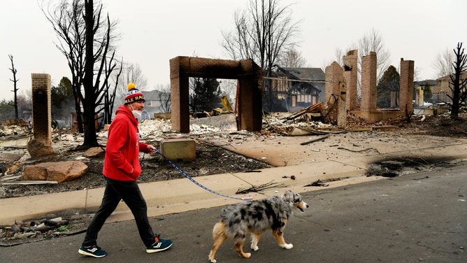 Image 3 of 93LOUISVILLE, CO - DECEMBER 31: Jim Barlow and his dog Titan walk along Augusta Drive as they walk past homes that are burned to the ground in the Coal Creek Ranch subdivision in the aftermath of the Marshall Fire on December 31, 2021 in Louisville, Colorado. The fire may have potentially burned 1000 homes and numerous business. The fast moving fire was stocked by extremely dry drought conditions and fierce winds, with gusts topping 100 mph, along the foothills. (Photo by Helen H. Richardson/MediaNews Group/The Denver Post via Getty Images) ( )