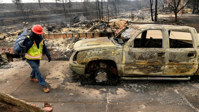 Image 11 of 93LOUISVILLE, CO - DECEMBER 31: Xcel Energy worker James Hernandez walks past burned vehicles as he helps look for gas and electric lines amidst the rubble of homes that are burned to the ground in the Coal Creek Ranch subdivision in the aftermath of the Marshall Fire on December 31, 2021 in Louisville, Colorado. The fire may have potentially burned 1000 homes and numerous business. The fast moving fire was stocked by extremely dry drought conditions and fierce winds, with gusts topping 100 mph, along the foothills. (Photo by Helen H. Richardson/MediaNews Group/The Denver Post via Getty Images) ( )