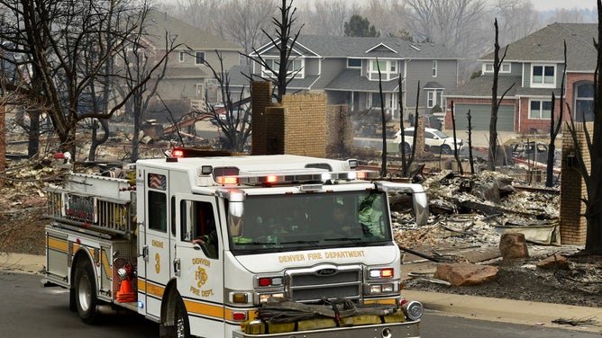 Image 5 of 93LOUISVILLE, CO - DECEMBER 31: A Denver Fire Department engine checks on homes in the Coal Creek Ranch subdivision in the aftermath of the Marshall Fire on December 31, 2021 in Louisville, Colorado. The fire may have potentially burned 1000 homes and numerous business. The fast moving fire was stocked by extremely dry drought conditions and fierce winds, with gusts topping 100 mph, along the foothills. (Photo by Helen H. Richardson/MediaNews Group/The Denver Post via Getty Images) ( )