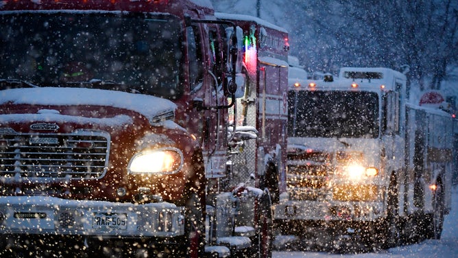 Image 9 of 93LOUISVILLE, CO - DECEMBER 31: Berthoud Fire Department firefighter Alec Huggins walks back to his engine in the heavy snow as he and his team wait to be demobilized off of the Marshall Fire at the staging at the Louisville Recreation Center on December 31, 2021 in Louisville, Colorado. A type I team will be taking over management of the fire. The fire potentially may have burned 1000 homes and numerous business. The fast moving fire was stocked by extremely dry, drought conditions and fierce winds, with gusts topping 100 mph, along the foothills. (Photo by Helen H. Richardson/MediaNews Group/The Denver Post via Getty Images) ( )