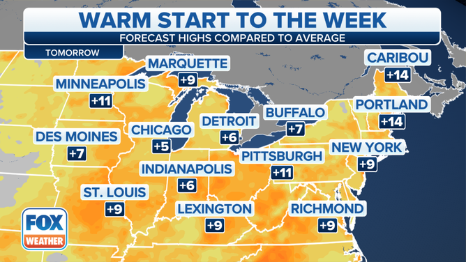 It will be an unseasonably warm start to the week for much of the eastern half of the United States.