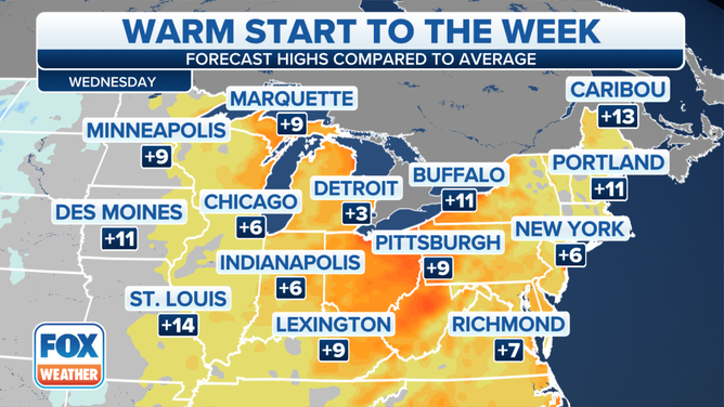 It's going to be a warm start to the week for much of the country as unseasonably warm air moves in, allowing temperatures to reach 5 to 15 degrees above average.