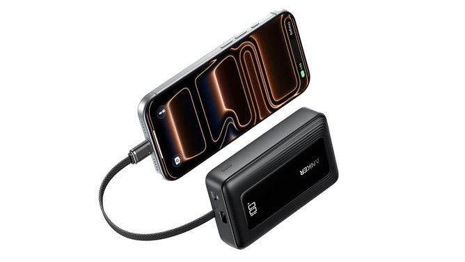 This slim Anker power bank packs serious power into a pocket-size design. It comes with a flexible built-in cord that stretches as needed, and the durable body stands up to a few hard drops. It can fully charge an iPhone 15 twice and boost battery life from 0% to 50% in about 30 minutes. Use the built-in cord and output port to charge multiple devices with ease.