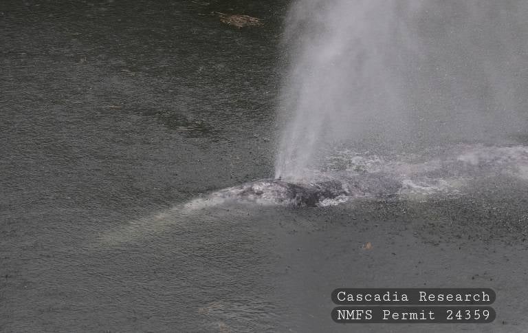 The gray whale blowing water from its hole in the Willapa River.
