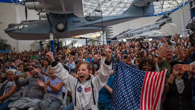 A young boy wears an astronaut costume next to a woman waving a flag as they watch a live broadcast of the return of the Artemis II crew members to Earth at the San Diego Air and Space Museum during a watch party for the crew's splash down in the Pacific Ocean, in San Diego, California, on April 10, 2026.