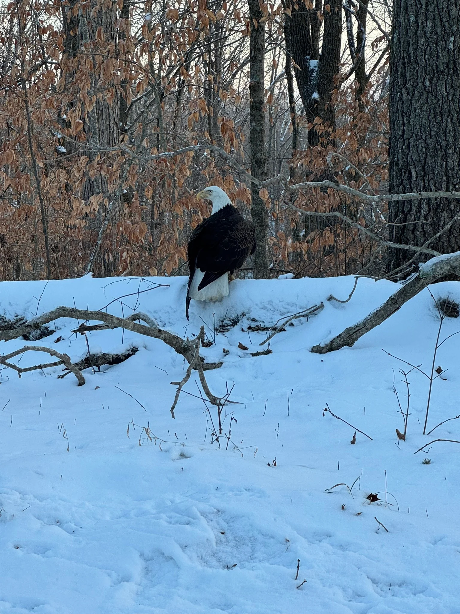 The injured bald eagle sits on a snowy embankment in Lake Cumberland State Resort Park in Kentucky.