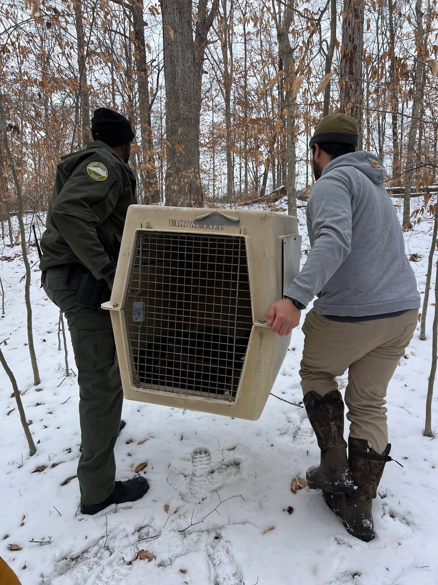 A team carries the injured eagle in a cage to be evaluated.