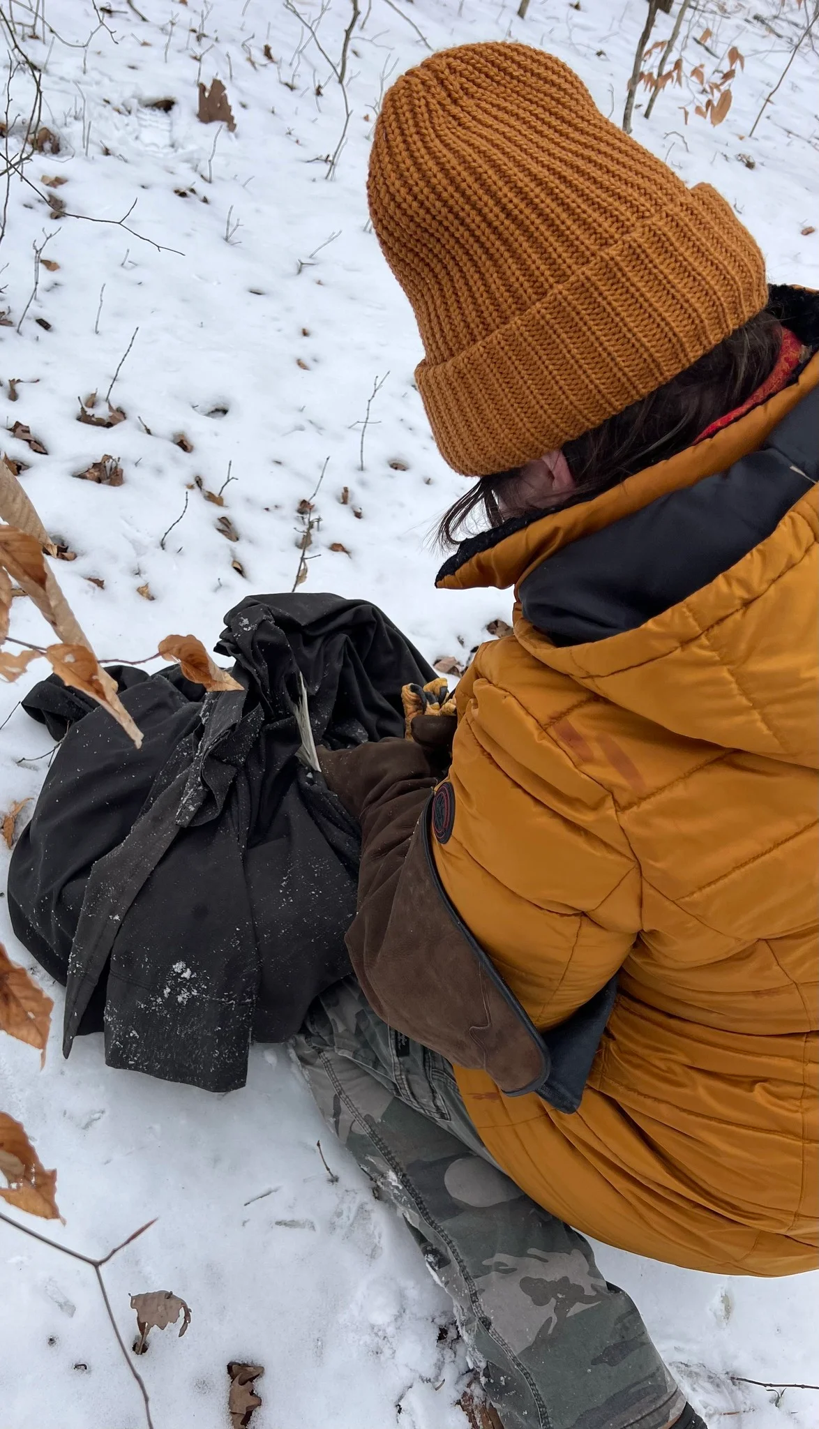 The injured eagle is covered with a cloth and secured to be taken to a veterinarian.