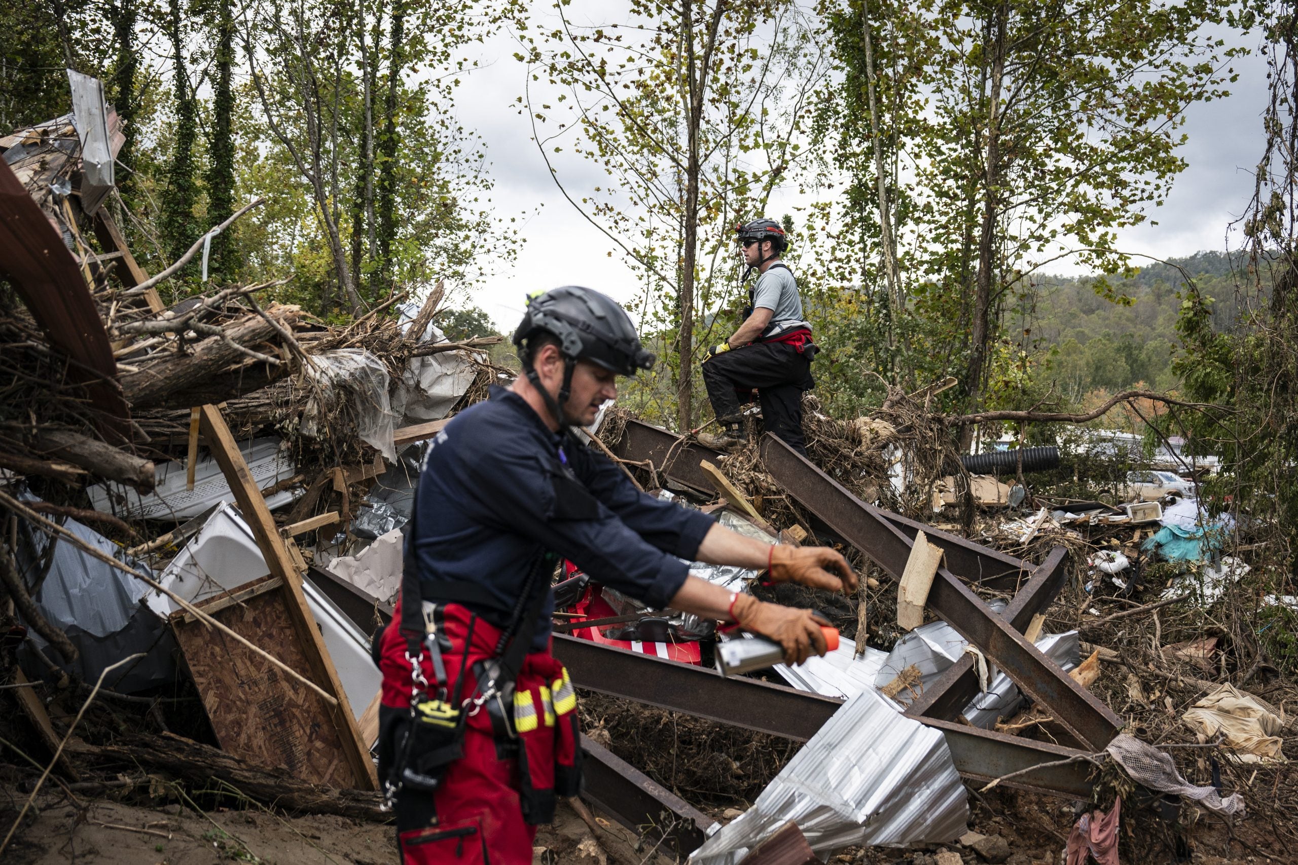 Swannanoa, NC — October 1 : Members of the Illinois Water Rescue One team search through debris for survivors in the aftermath of Hurricane Helene in Swannanoa, North Carolina on Tuesday, Oct. 01, 2024.