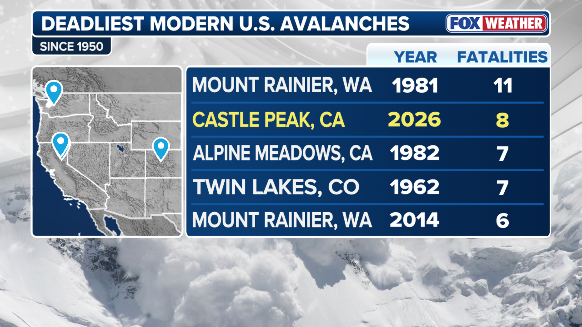 The Castle Peak avalanche marks the deadliest in over a decade on U.S. soil, since six died at Mount Rainier in 2014, according to the National Avalanche Center.