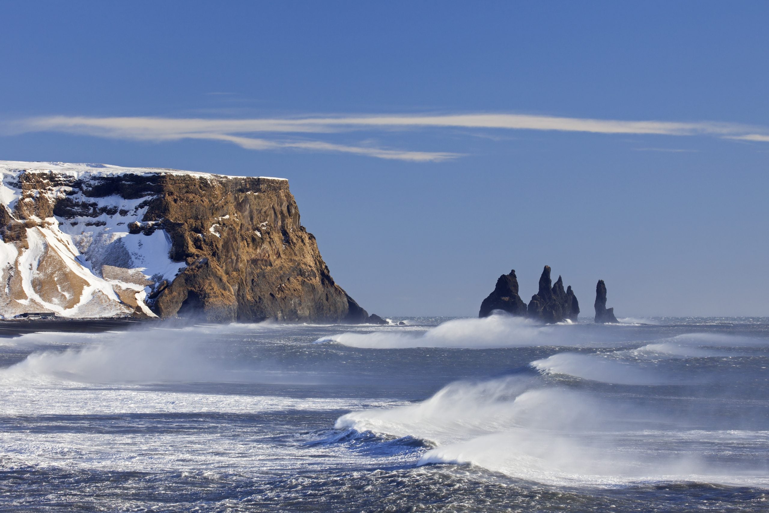 Reynisfjara Beach, also known as the black sand beach, is most famous for its black volcanic sand and towering rock pillars rising out of the North Atlantic Ocean.