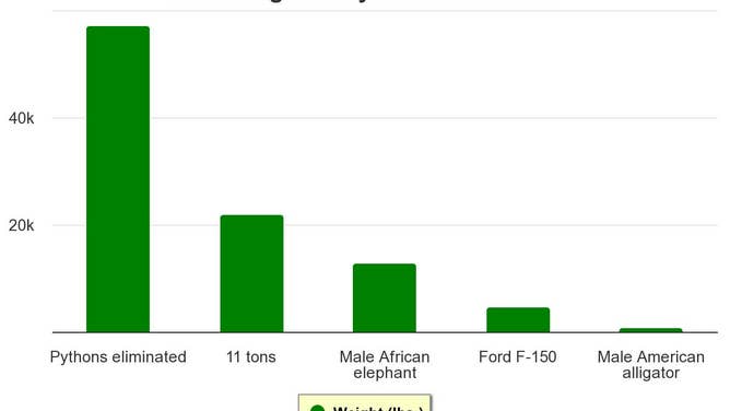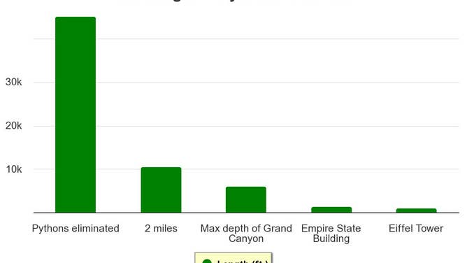 The FWC claimed that more than 18,000 pythons have been reported as removed from the wild in the state. The SFWMD has been keeping track since May 2017. It would take 31 Empire State Buildings to equal the combined length of snakes. The weight of snakes eliminated is equivalent to almost 8 Ford F-150 pickups.