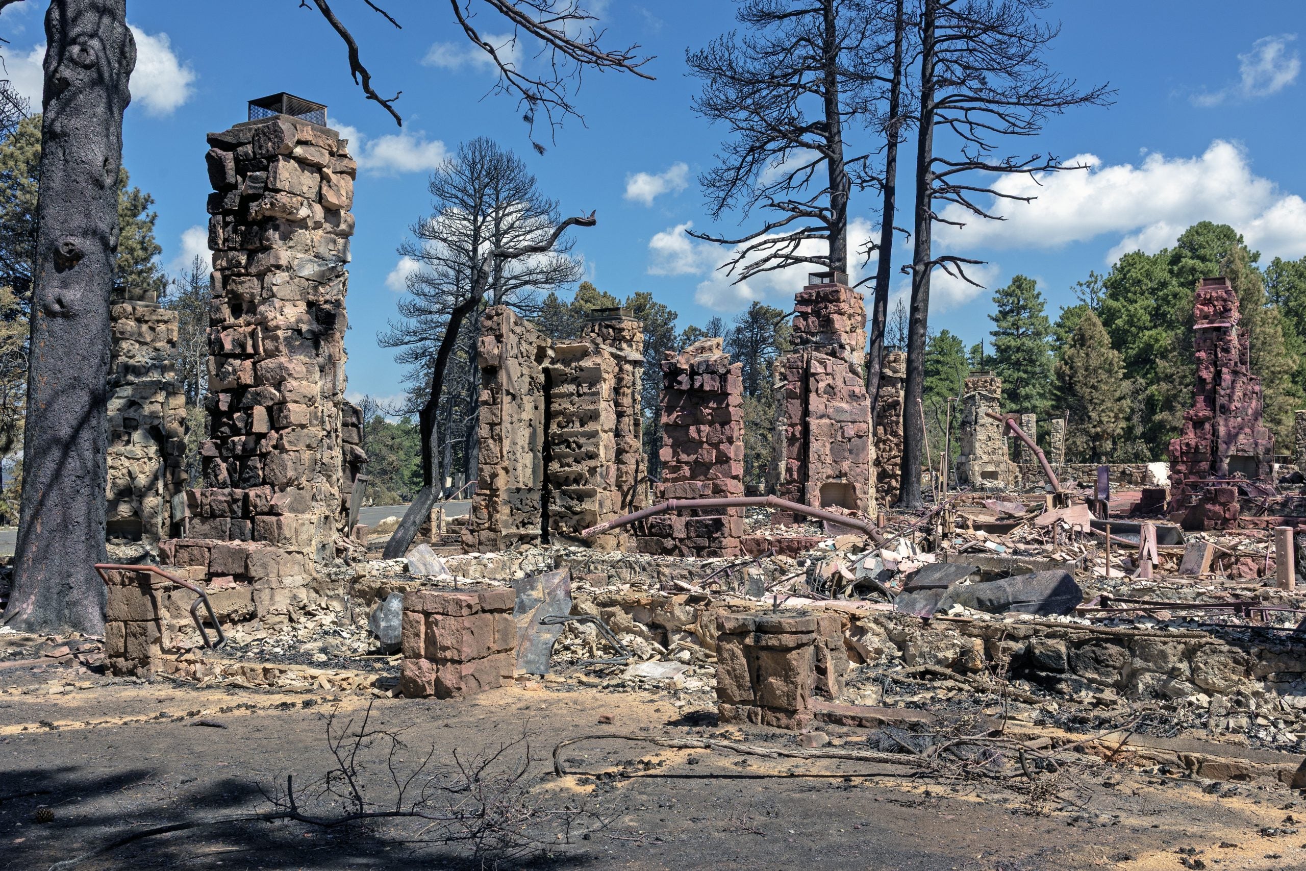 Stone chimneys remaining from Grand Canyon Lodge deluxe cabins that burned when the Dragon Bravo Fire passed through this location on July 12-13, 2025.