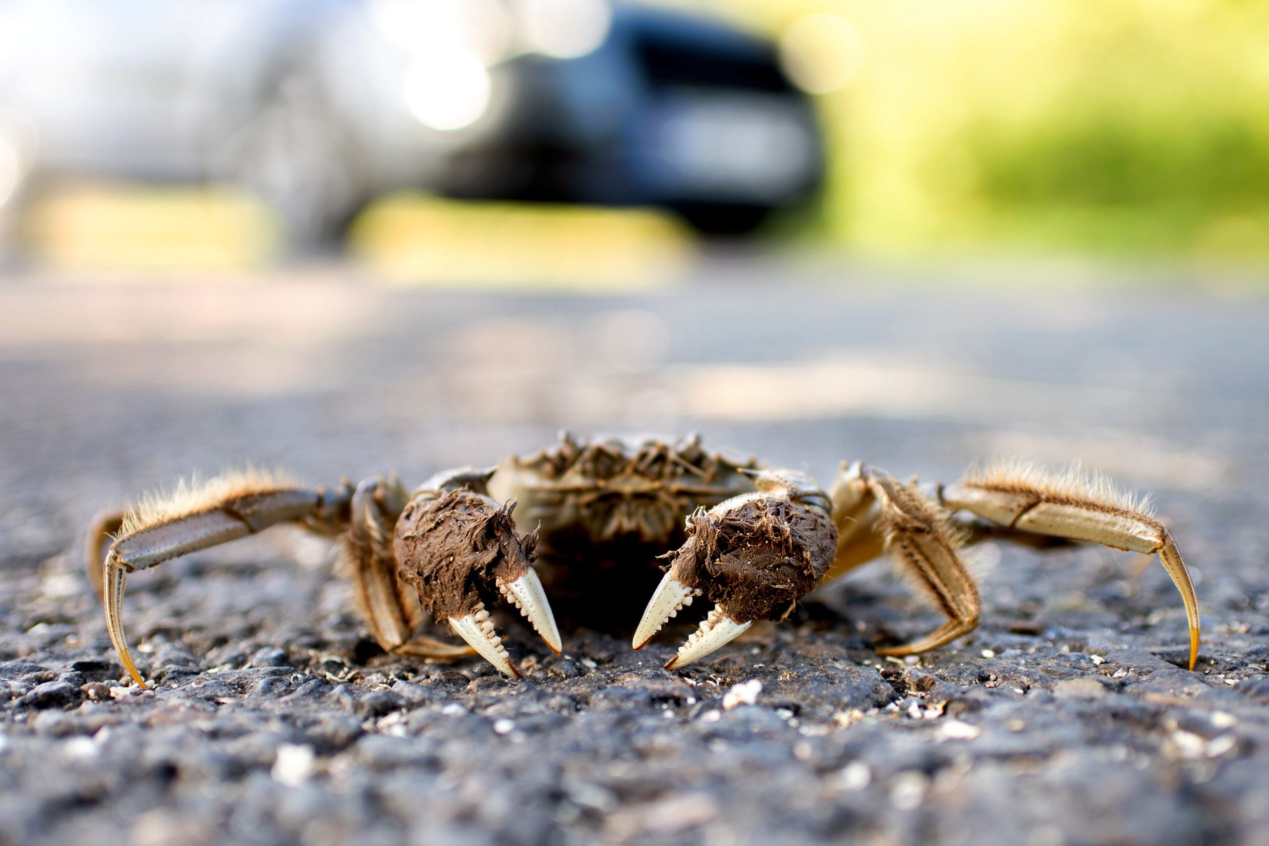 18 September 2019, Lower Saxony, Thedinghausen: A Chinese mitten crab hikes along a road near the Werder district.