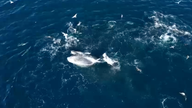 Researchers and experts say whales use a variety of factors, including ocean currents, seabirds and gulls, to their advantage during these feedings. Diving birds force the fish to stick together in a large ball close to the surface, while seagulls begin to swoop down at the cluster of fish.