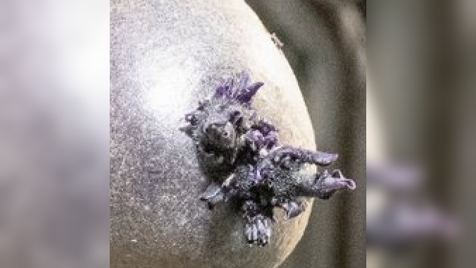 "I flew potatoes on Expedition 72 for my space garden, an activity I did in my off-duty time," astronaut Pettit said. "This is an early purple potato, complete with a spot of Velcro hook to anchor it in my improvised grow light terrarium."