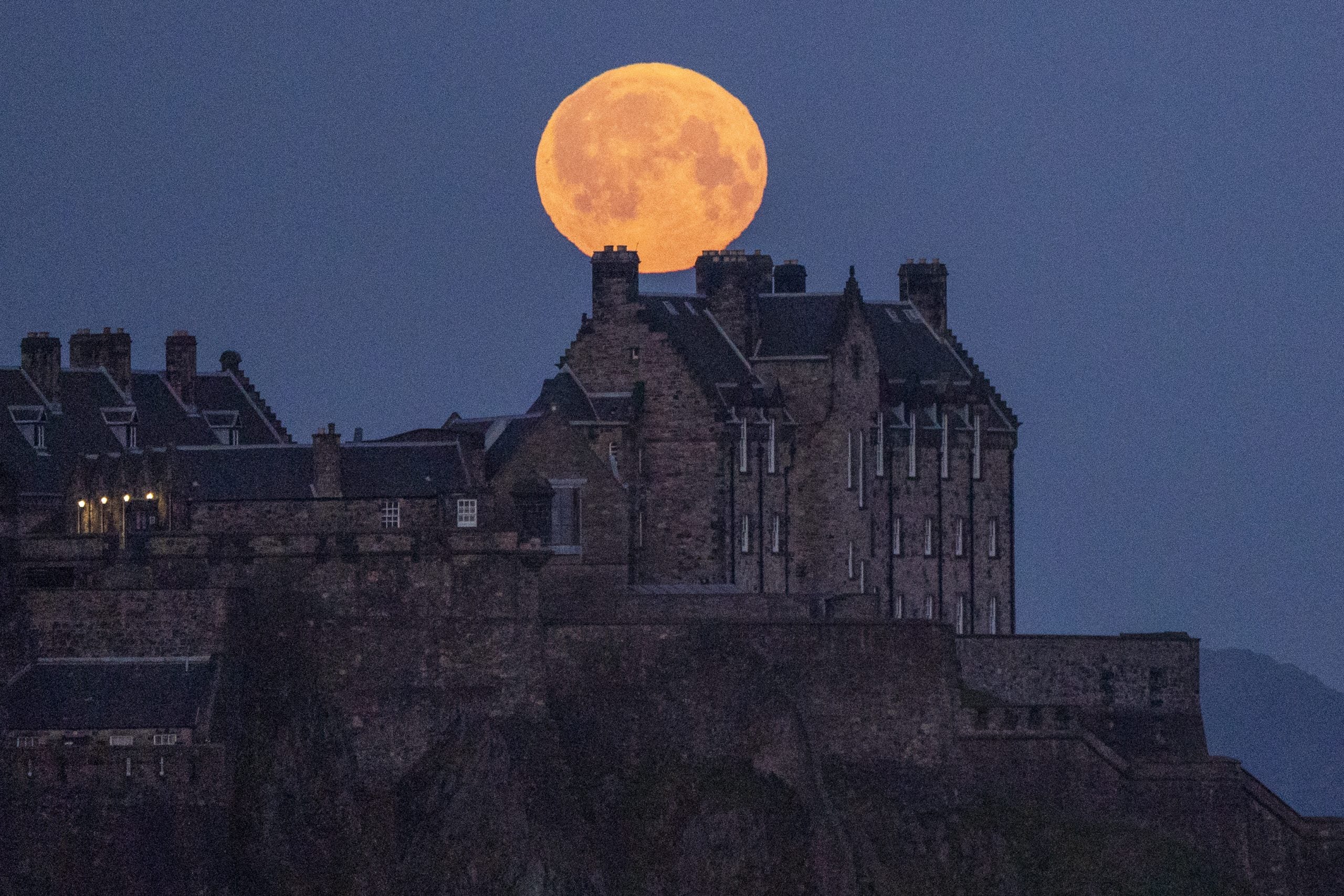 The full moon, which is known as the 'Pink Moon' during April, sets behind Edinburgh Castle. Picture date: Wednesday April 24, 2024.