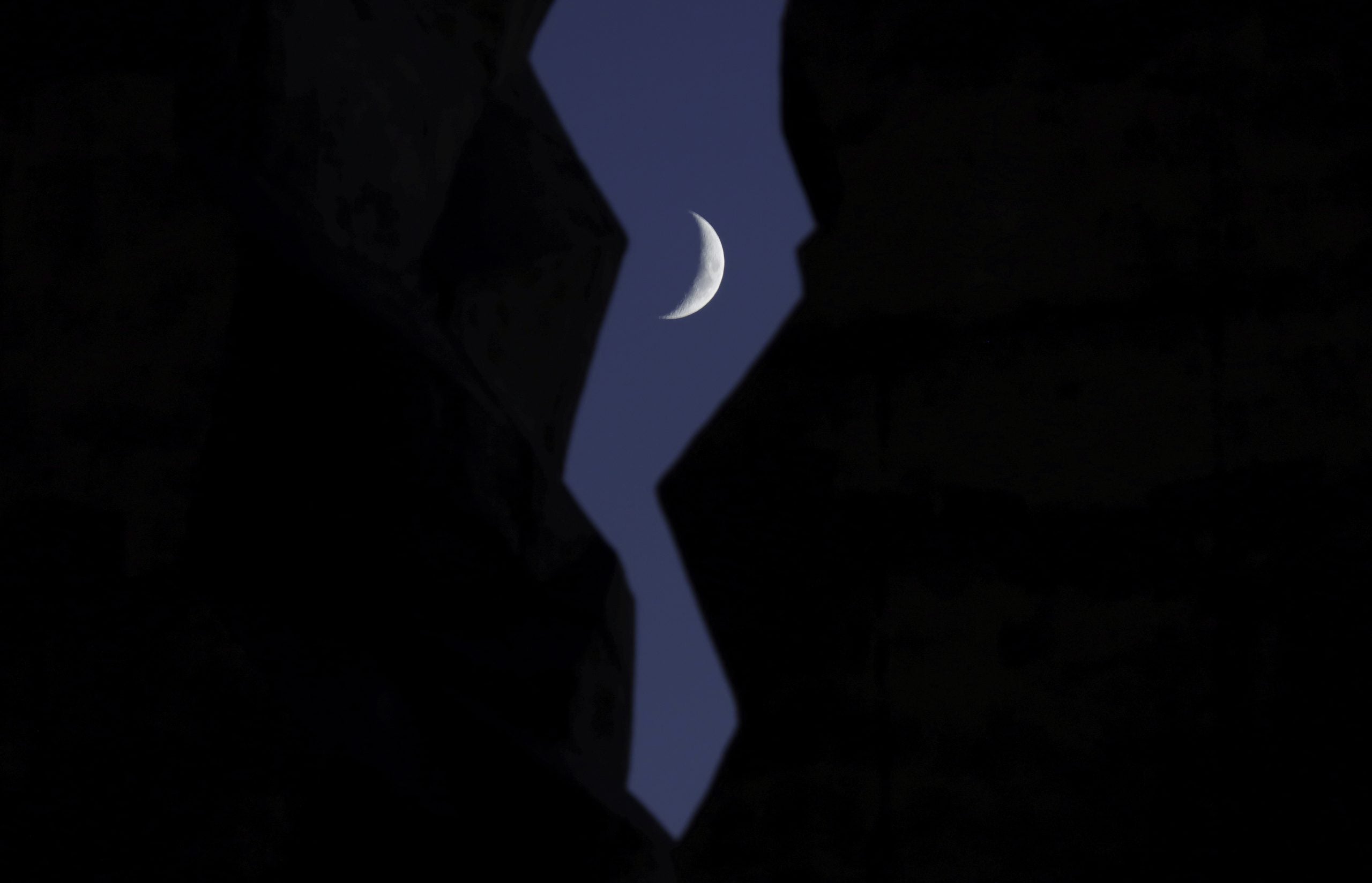 BAYONNE, NJ - OCTOBER 29: A 25 percent illuminated waxing crescent moon sets behind the Tear Drop 9/11 Memorial on October 29, 2022, in Bayonne, New Jersey.