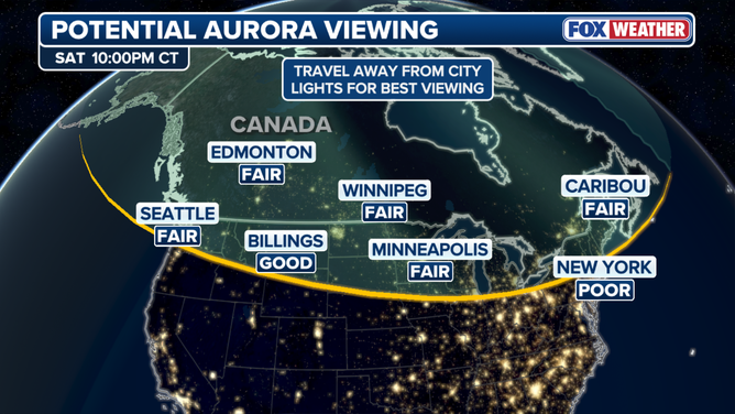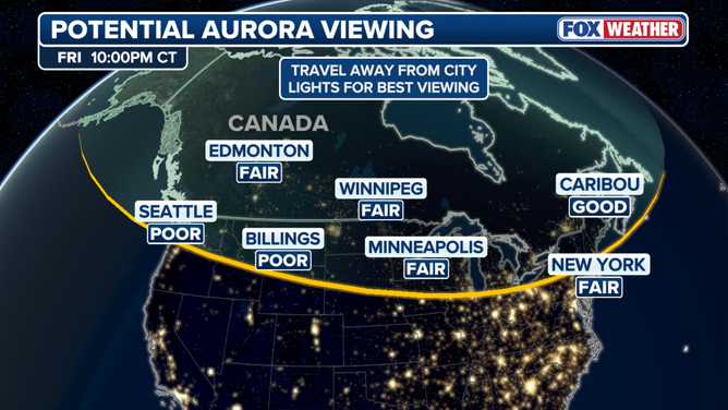 The Space Weather Prediction Center said auroras could be seen as far south as the Upper Midwest and northern states from New York to Idaho on Friday and Saturday night.