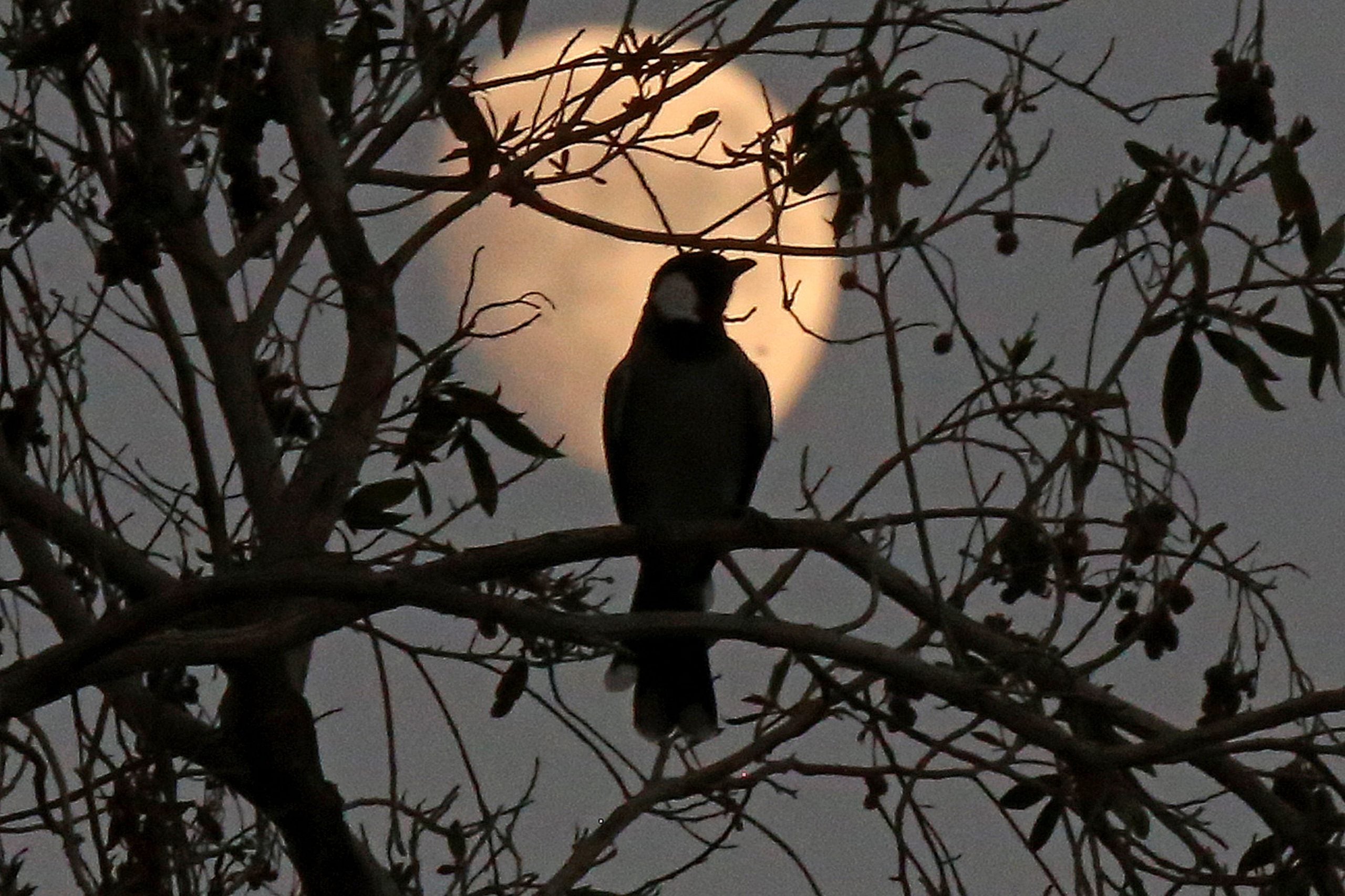 A white-eared bulbul perches on a tree branch as the waxing gibbous moon rises behind, in Kuwait City on October 6, 2022.