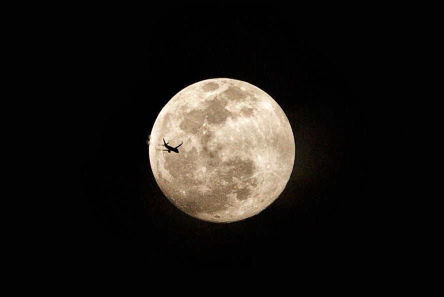 An airplane flies across the Supermoon full moon as it rises over Bekasi Regency, West Java province, Indonesia, on October 6, 2025. (Photo by Aditya Irawan/NurPhoto via Getty Images)