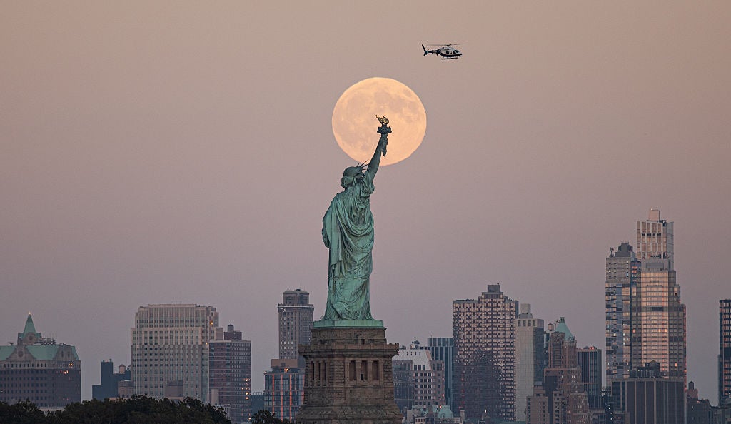 The full Harvest Supermoon rises behind the Statue of Liberty in New York City on October 7, 2025, as seen from Jersey City, New Jersey. (Photo by Lokman Vural Elibol/Anadolu via Getty Images)