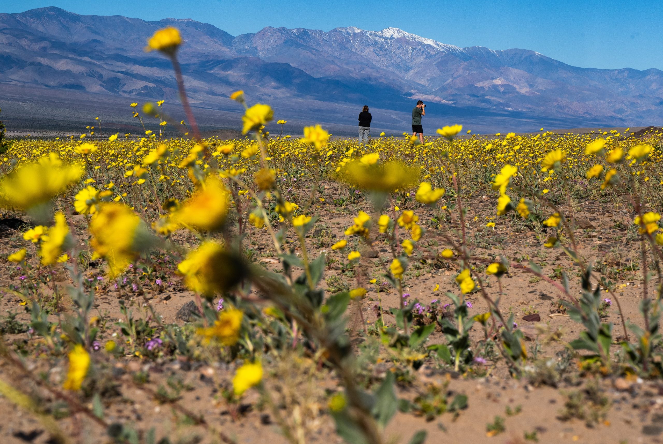 Desert sunflowers and desert sand-verbena bloom south of the Badwater area of Death Valley National Park on Saturday Feb. 28, 2026.