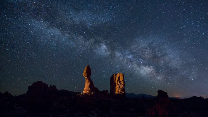 The Milky Way over Balanced Rock in Arches National Park near Moab, Utah.