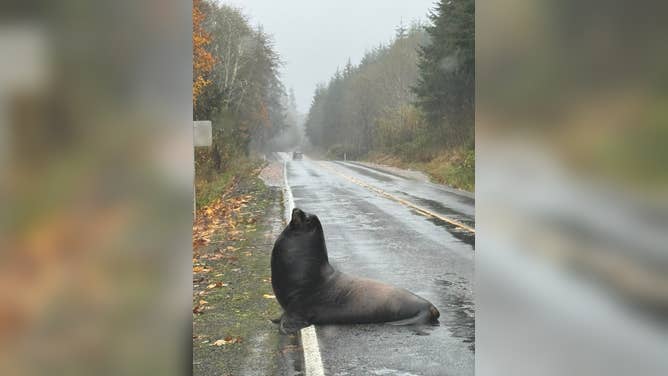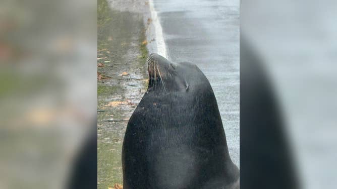 Watch: Wayward sea lion finds itself in the middle of the road during downpour in Washington state
