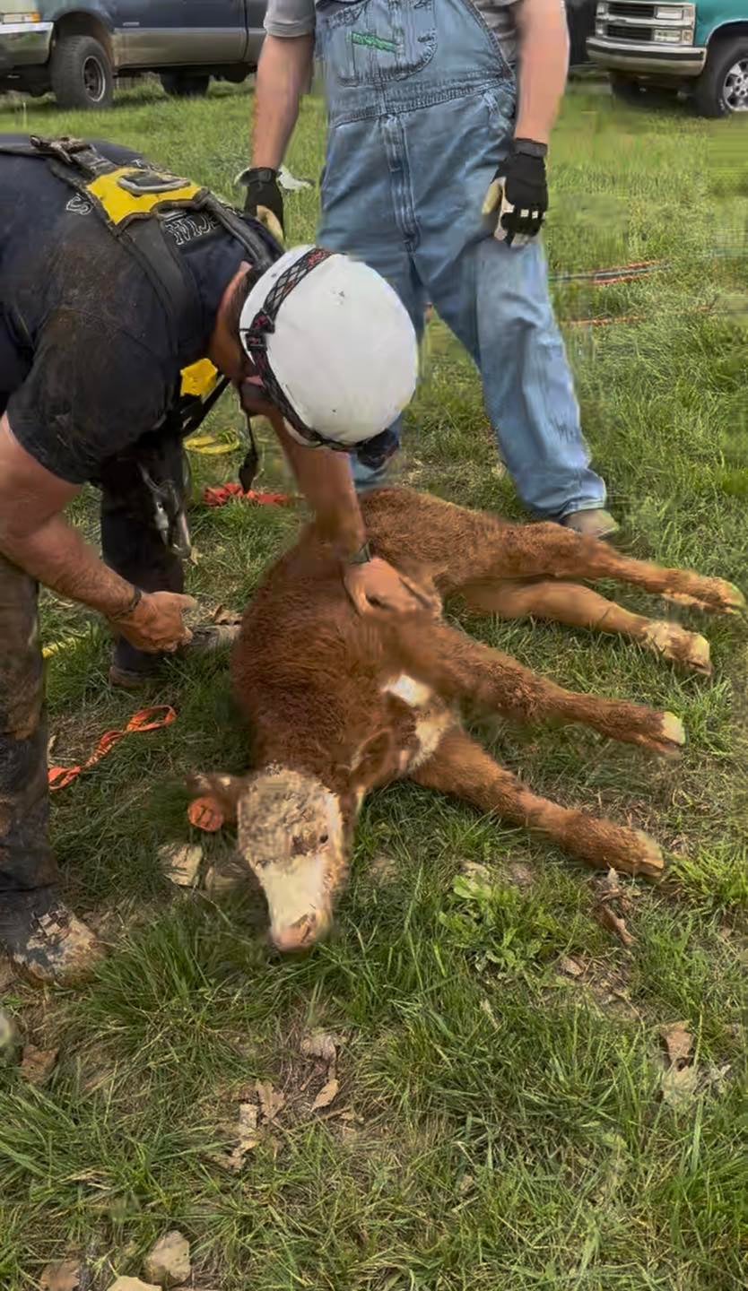 Those on the ground created a haul system to hoist the cow out of the hole.