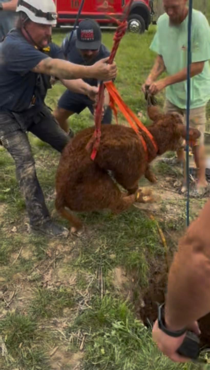 When a calf fell into a cave on Thursday, Lawrence County Fire and Rescue in Tennessee were called to help save the animal.