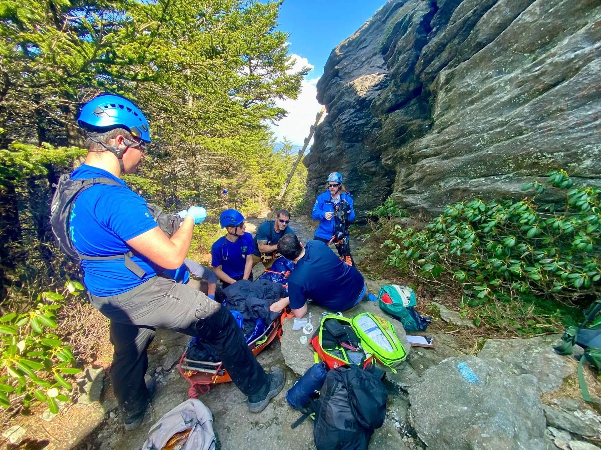 Members of the Linville-Central Rescue Squad reach an injured hiker along the Grandfather Trail in North Carolina.