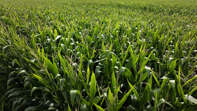 An aerial view shows corn growing in a farm field on July 24, 2025.