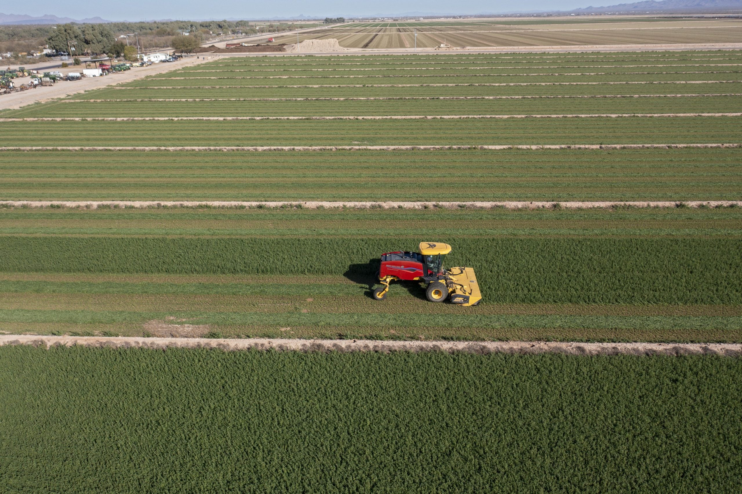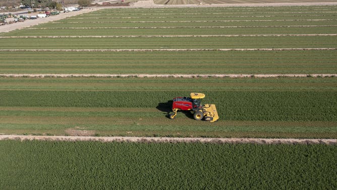 Buckeye, Arizona, A tractor cuts alfalfa on a farm in the Arizona desert.