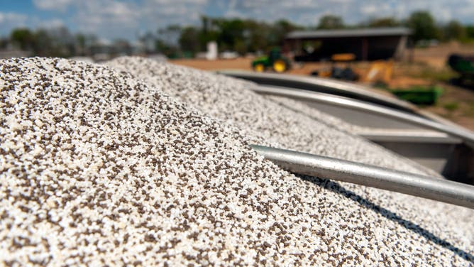 A mixture of urea and potash fertilizer is loaded onto a hopper before being spread on a corn field at a farm in Ruleville, Mississippi, US.