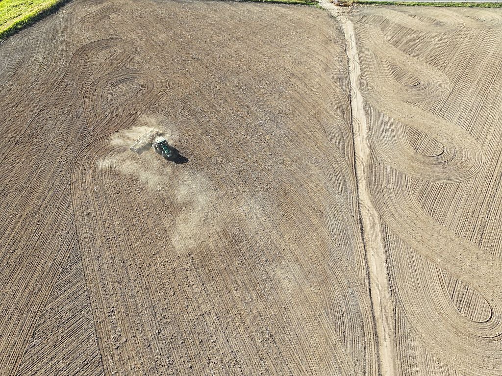 A farmer uses a tractor to plow a field before planting winter wheat.
