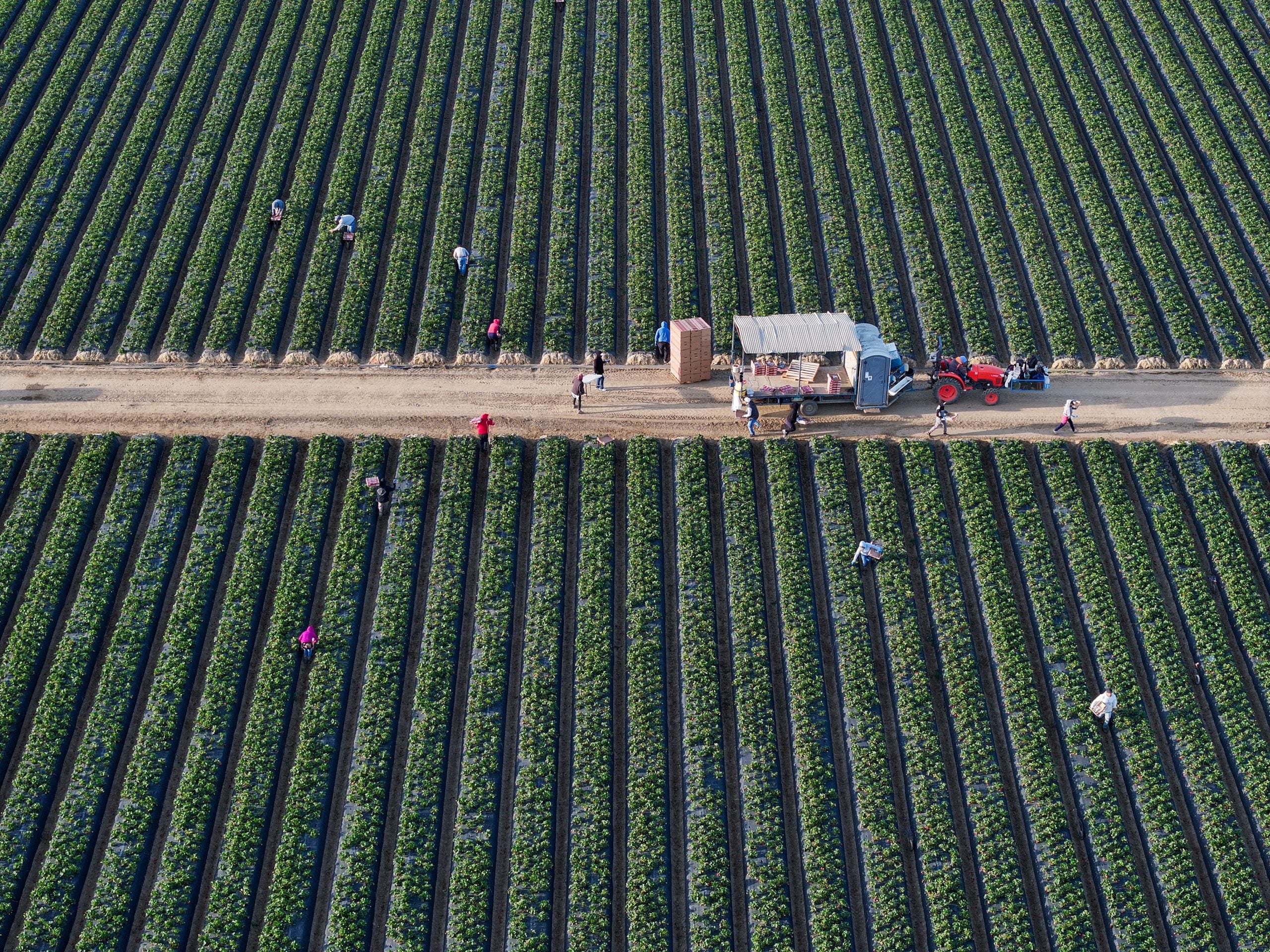 An aerial view of farm workers harvesting strawberries.