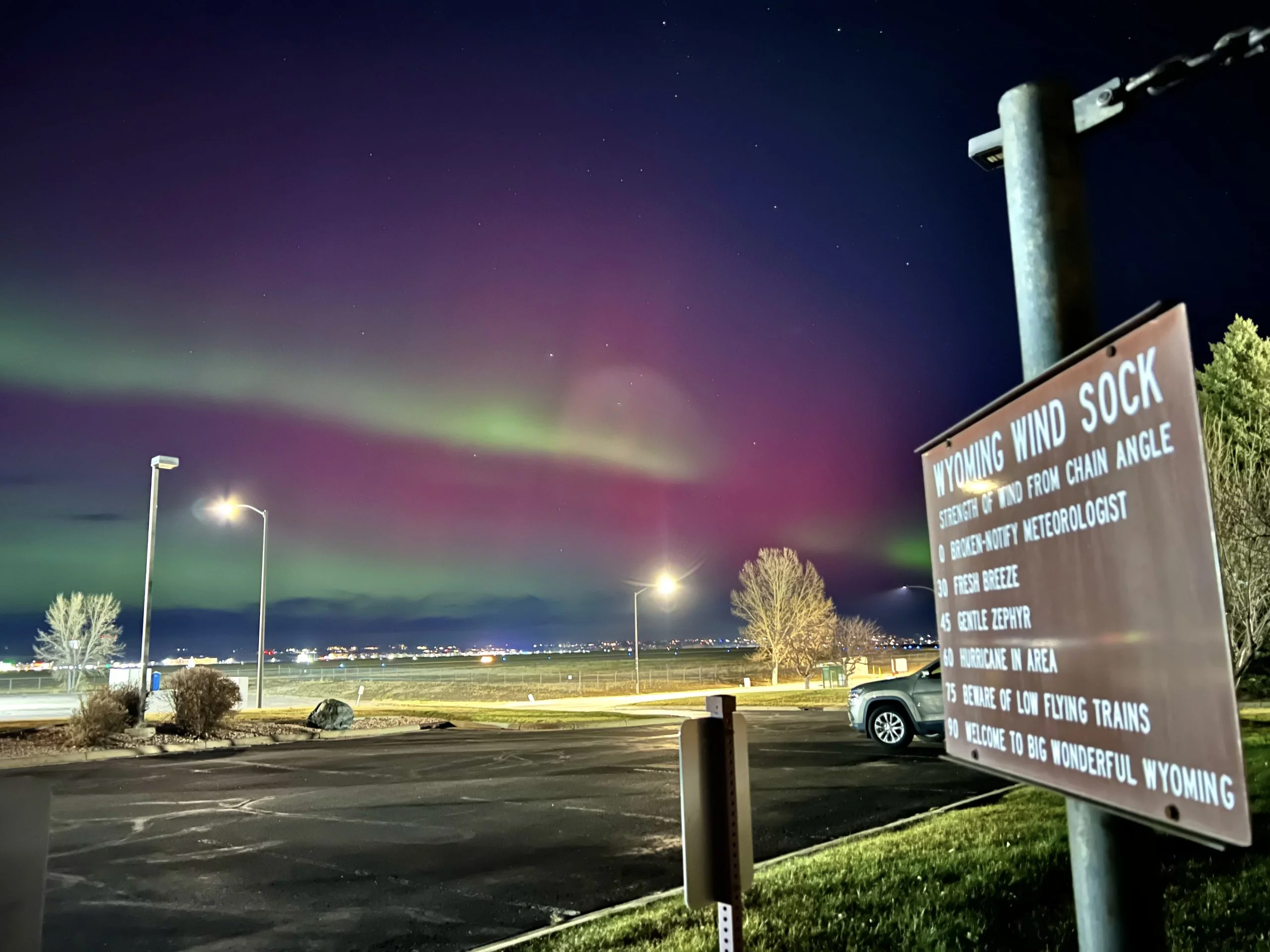 Northern Lights shine over the National Weather Service office in Cheyenne, WY