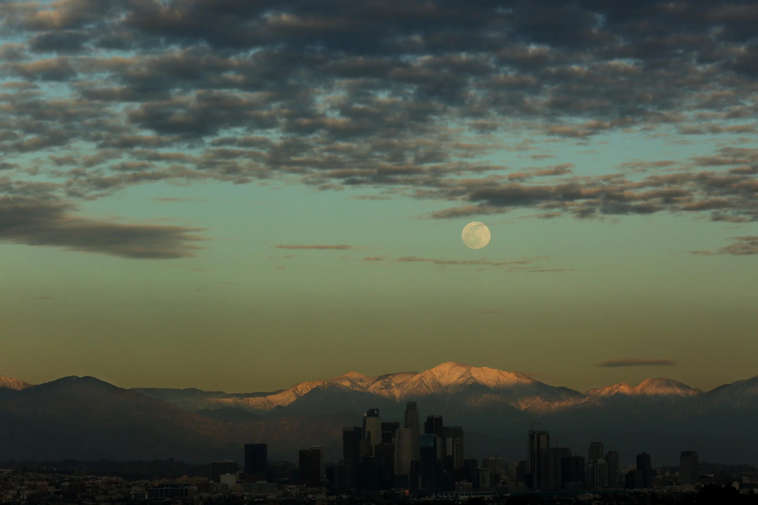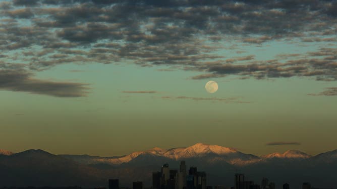 Los Angeles The moon rises behind the snow capped San Gabriel mountains and the Los Angeles skyline on January 27, 2021. Rain and possible thunderstorms are expected for Thursday according to the National Weather Service.
