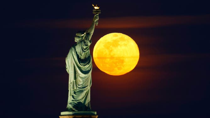 The full Snow Moon rises behind the Statue of Liberty and Brooklyn in New York City on February 24, 2024, as seen from Jersey City, New Jersey.