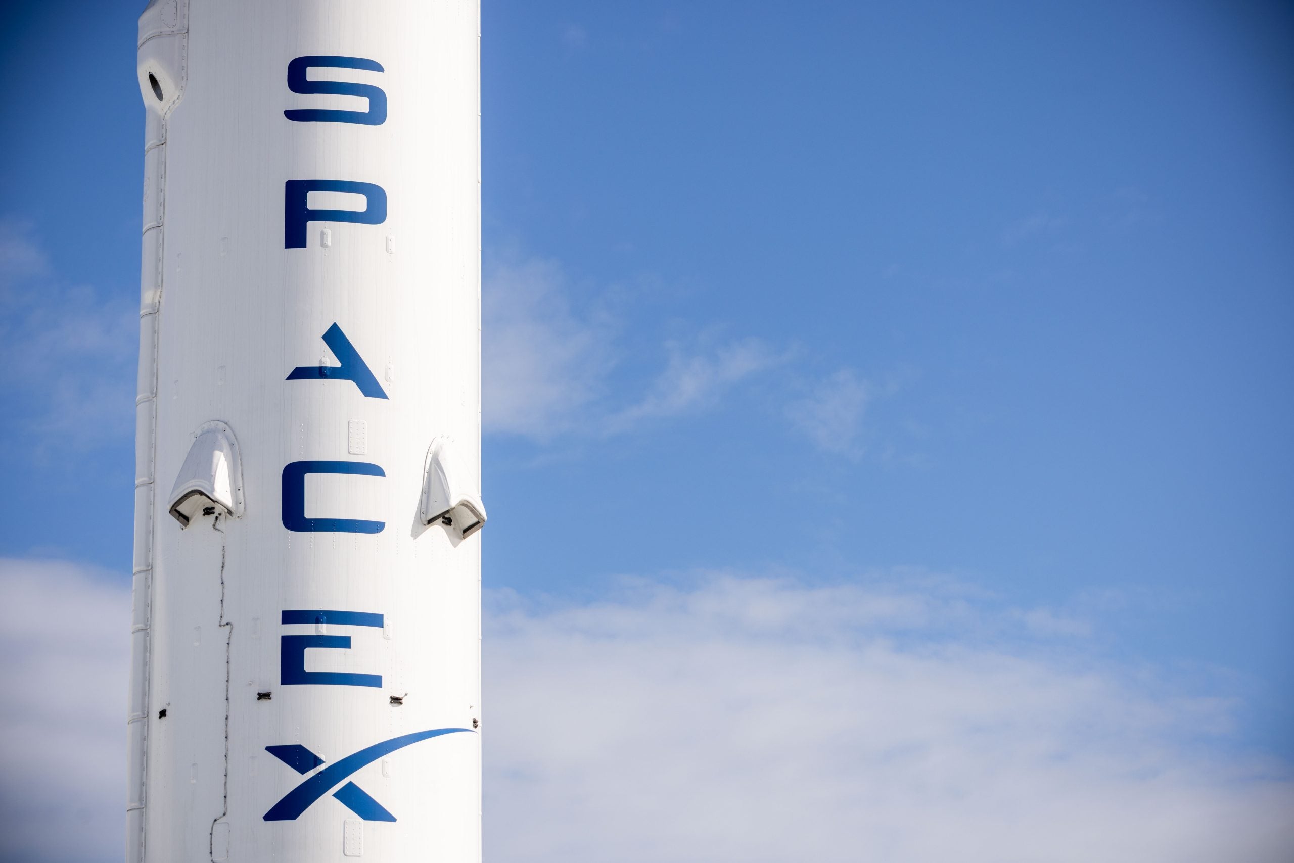 A SpaceX Falcon 9 reusable rocket booster on display outside the company's facilities in Hawthorne, California, US, on Monday, April 13, 2026.