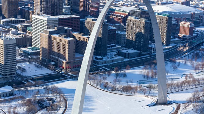 Aerial view of the gateway arch in Winter with snow, St. Louis, Missouri.